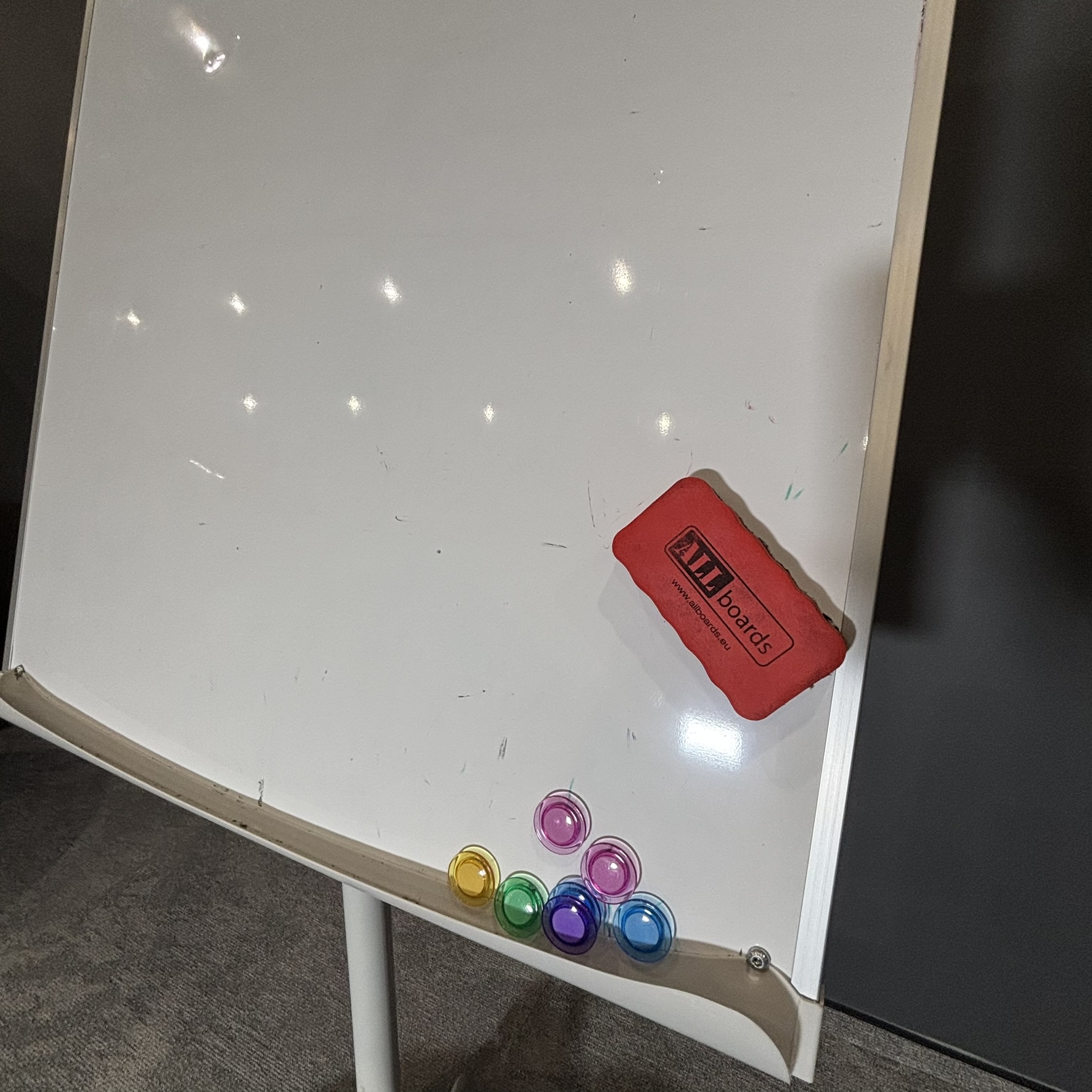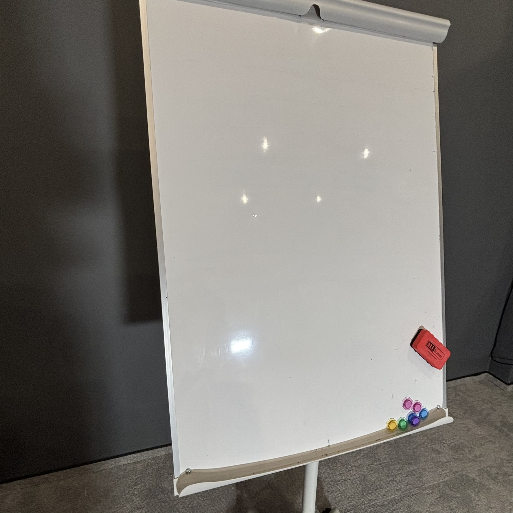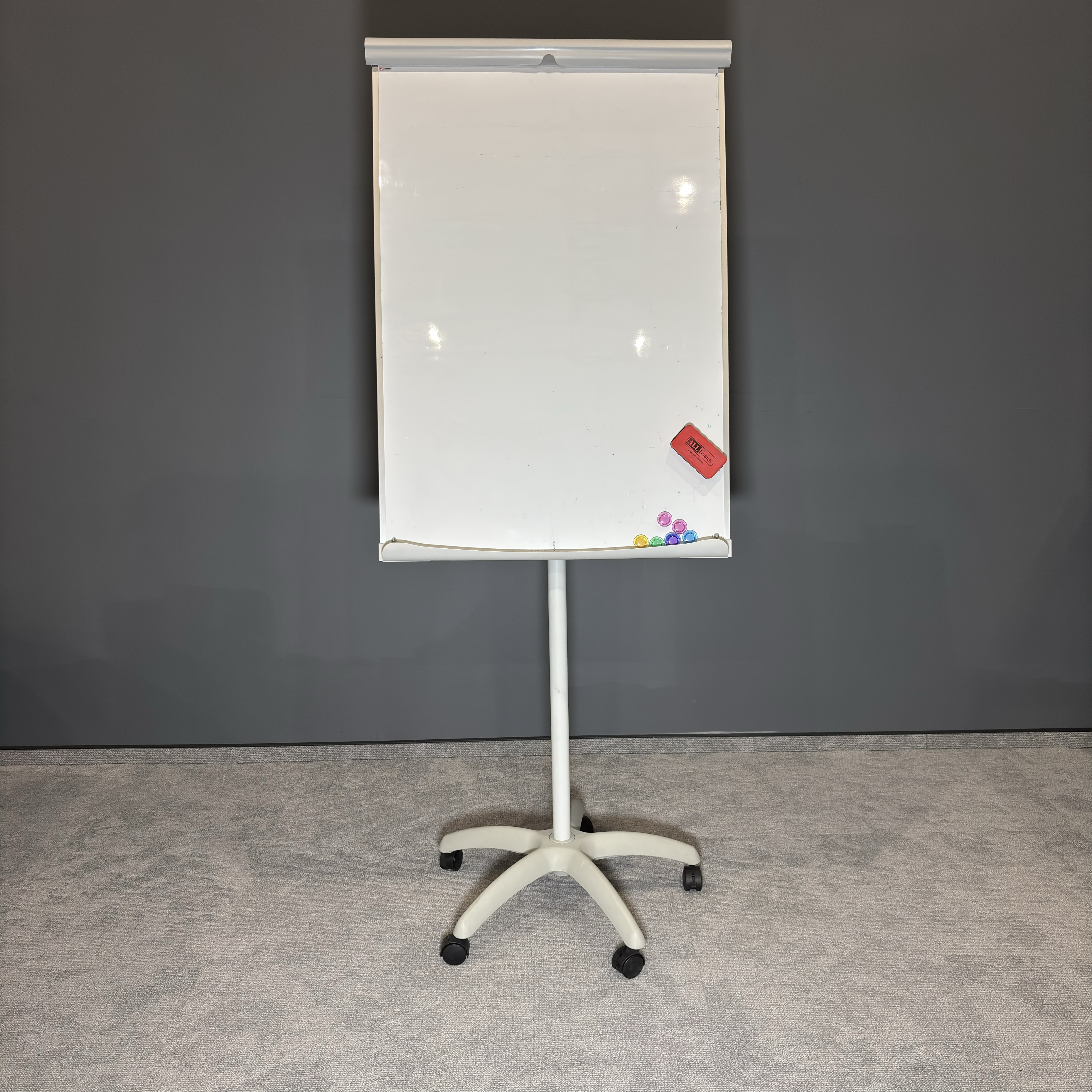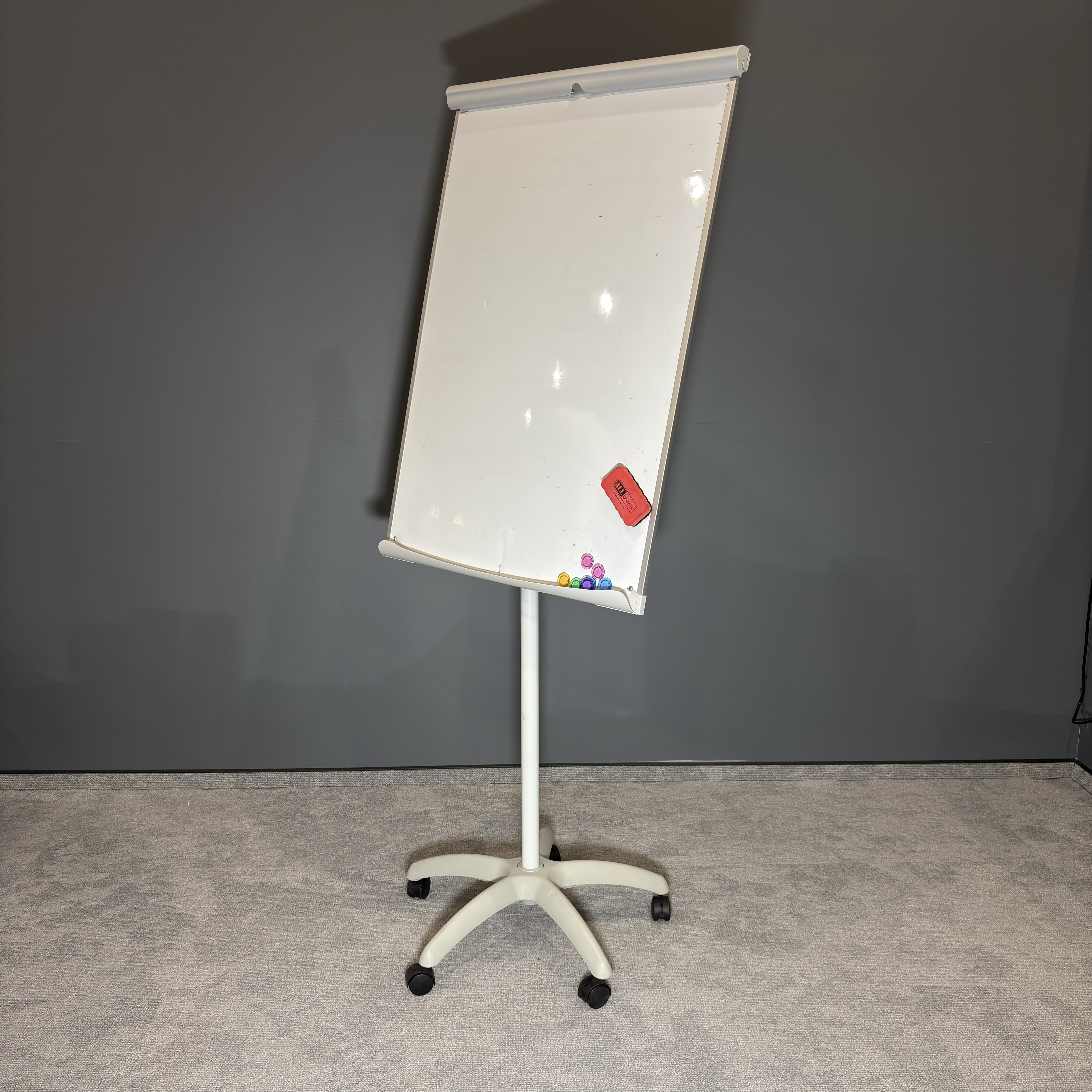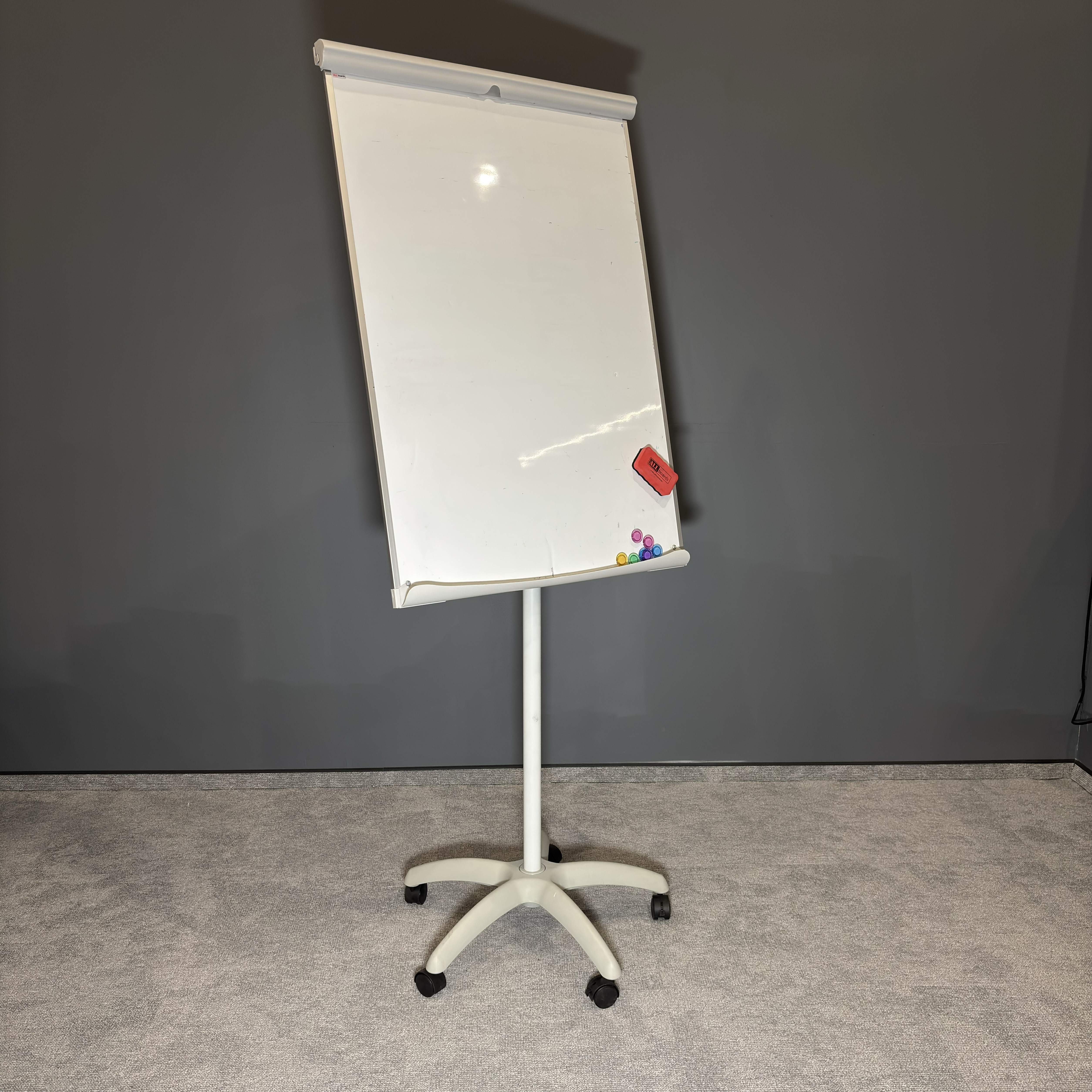 Flipchart w stanie używanym – w pełni funkcjonalny, z normalnymi śladami użytkowania. Powierzchnia robocza gotowa do dalszego użytkowania.