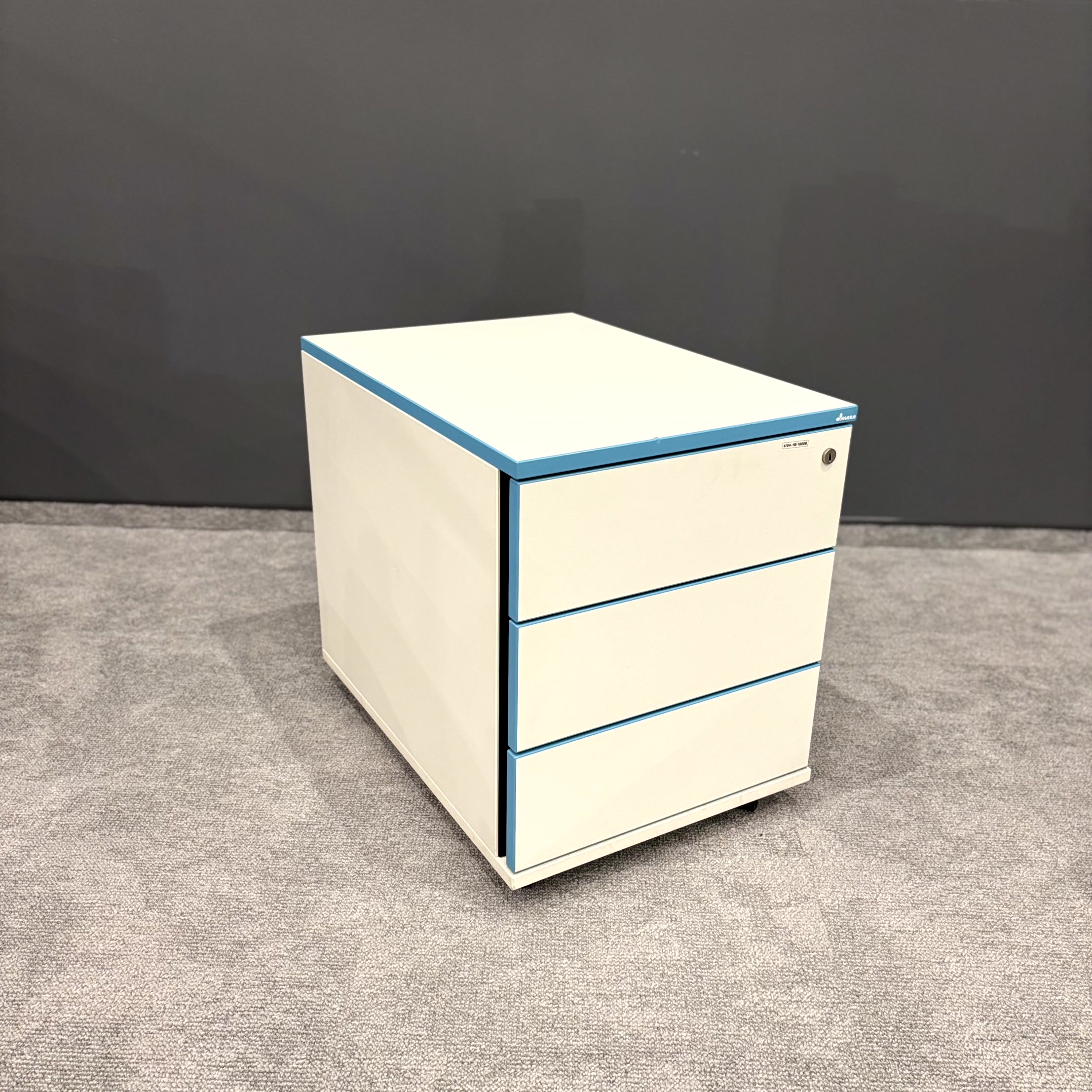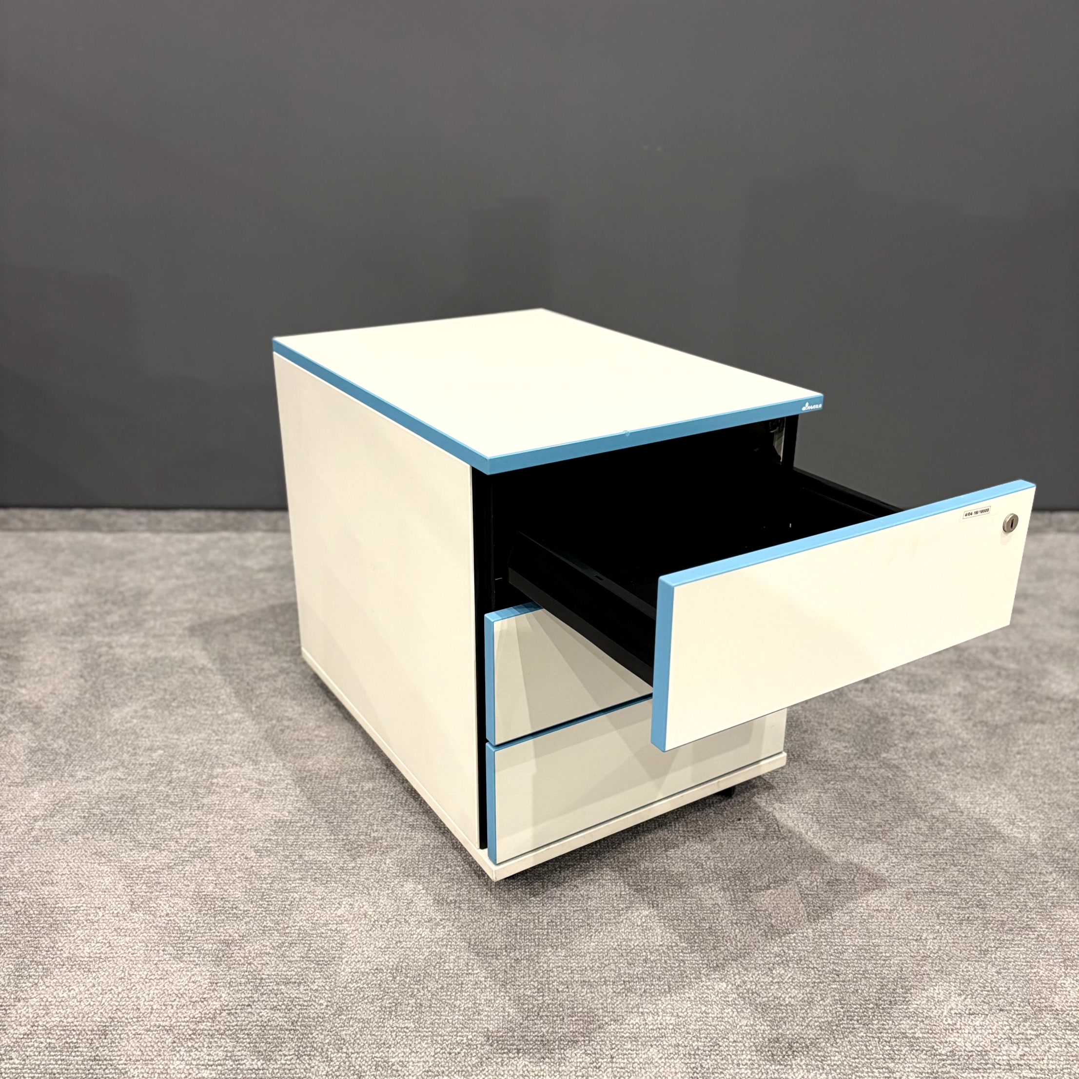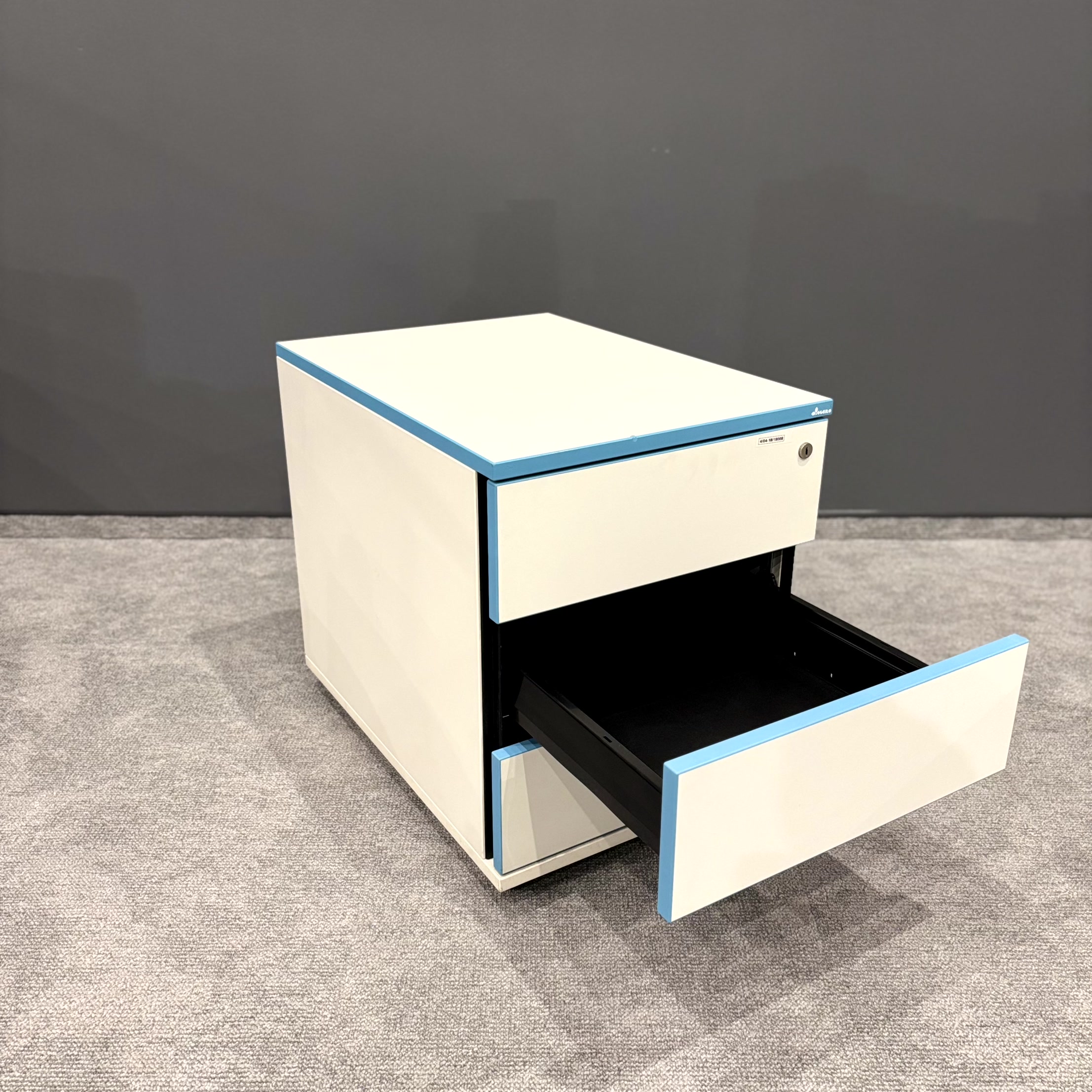 Korpus w kolorze białym został uzupełniony charakterystycznymi niebieskimi obrzeżami, które nadają meblowi nowoczesny i wyróżniający się wygląd. Kompaktowe wymiary pozwalają na wygodne wsunięcie kontenera pod biurko.