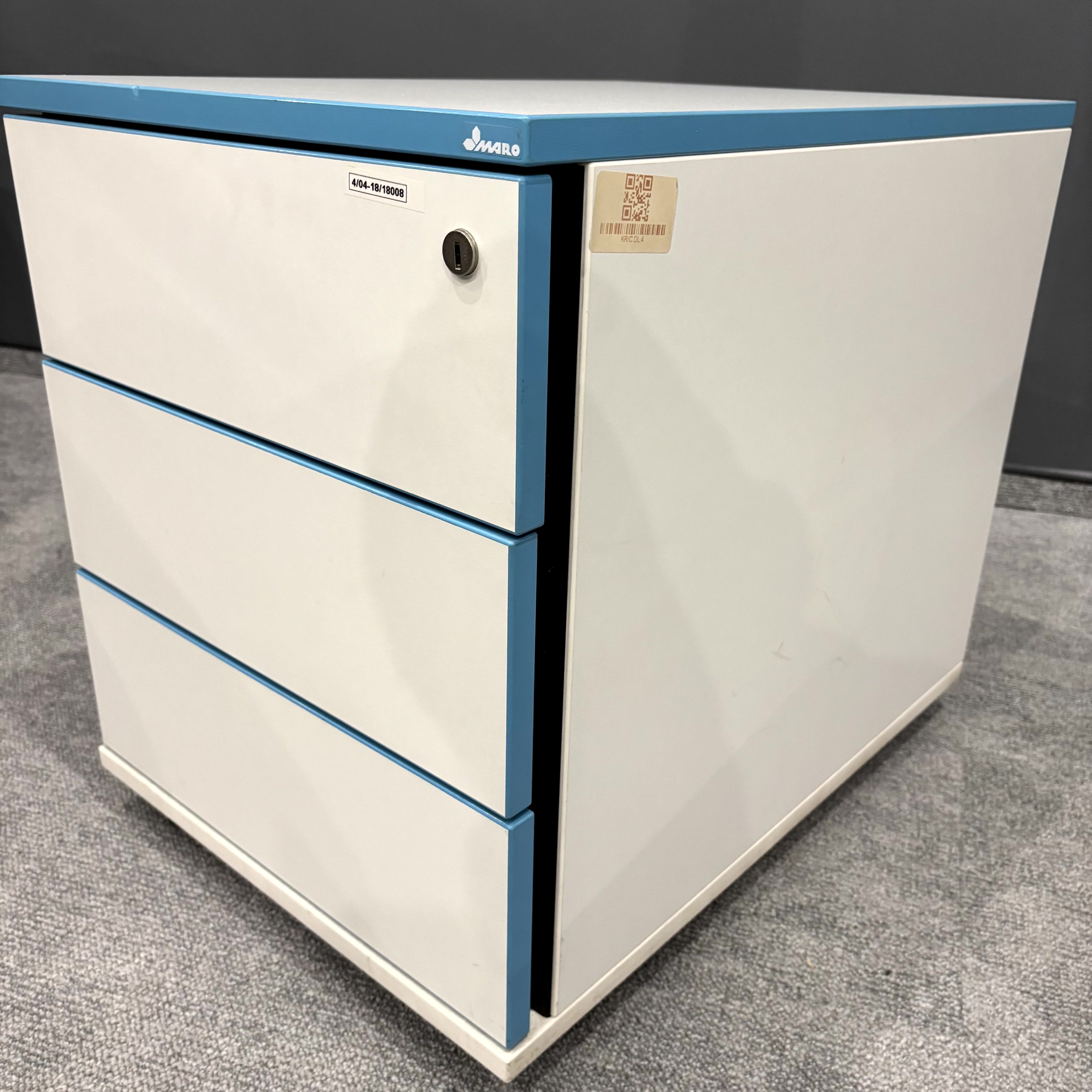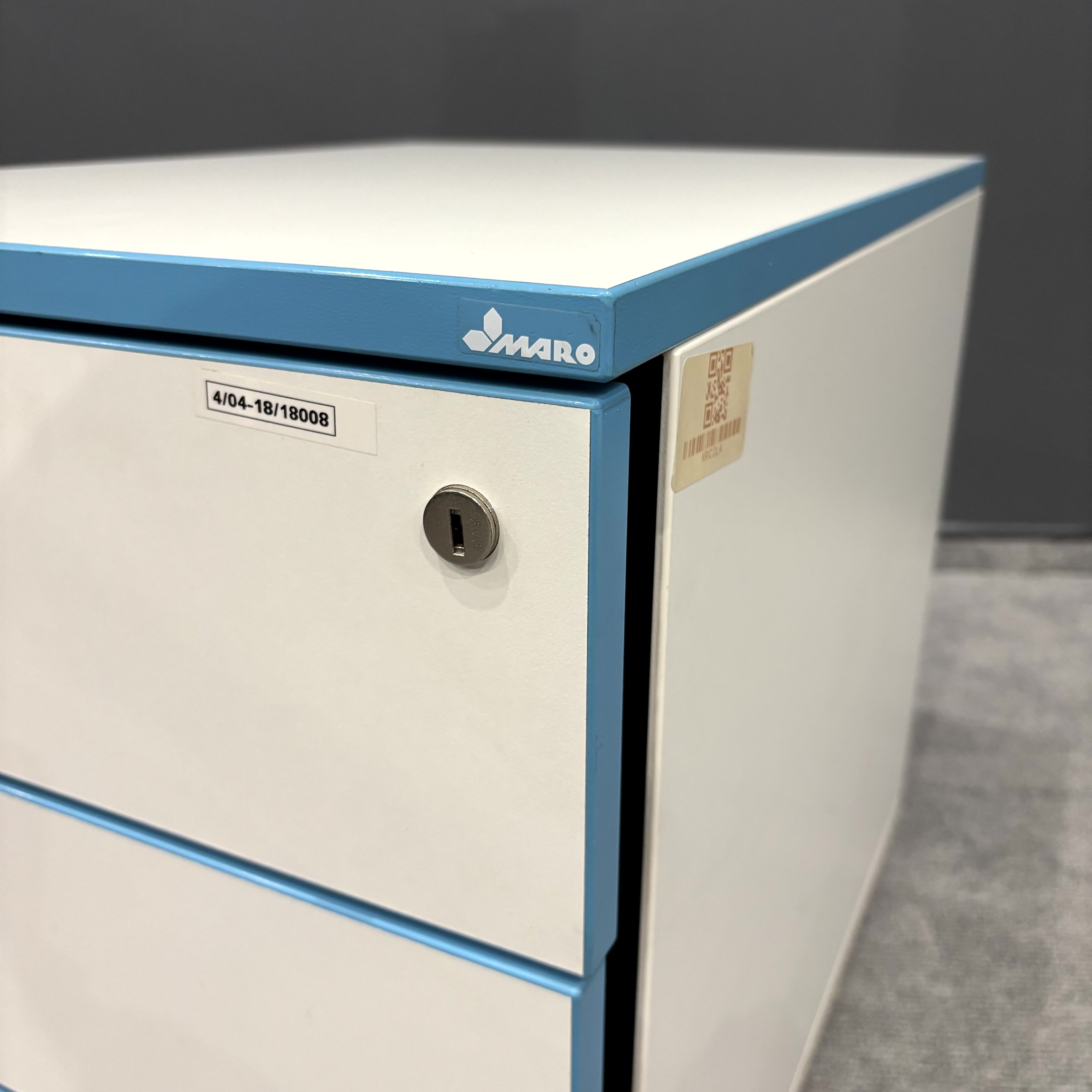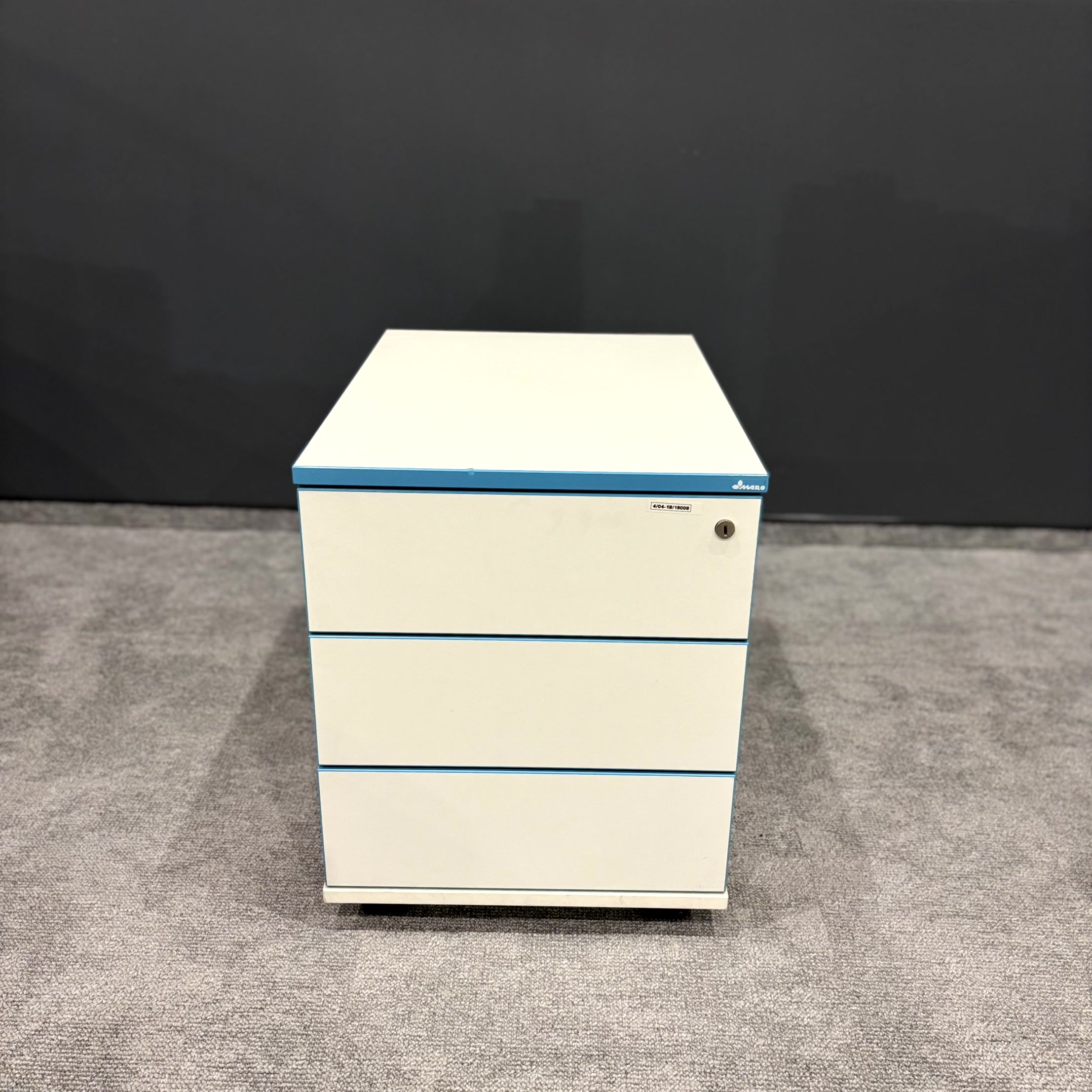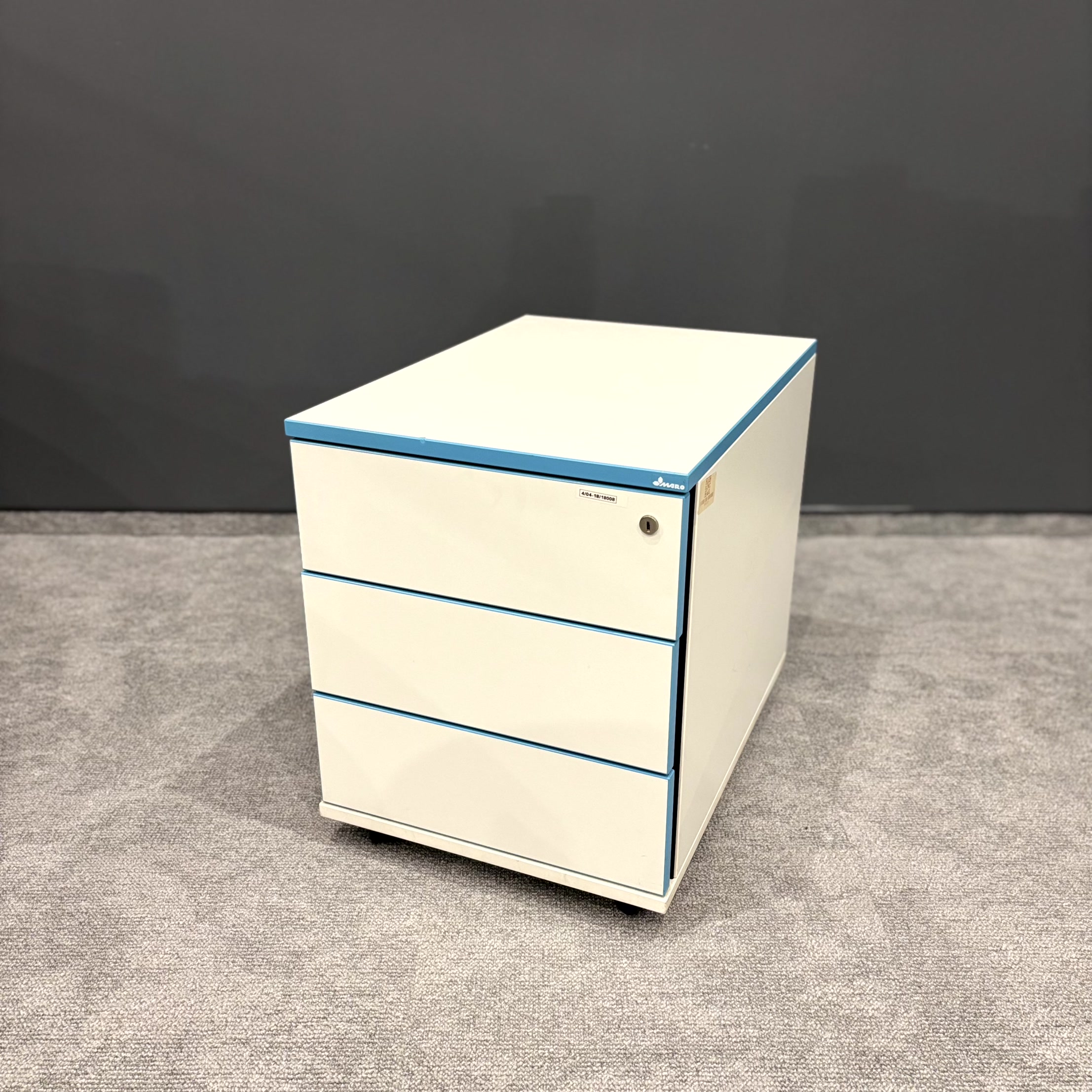 Korpus w kolorze białym został uzupełniony charakterystycznymi niebieskimi obrzeżami, które nadają meblowi nowoczesny i wyróżniający się wygląd. Kompaktowe wymiary pozwalają na wygodne wsunięcie kontenera pod biurko.
