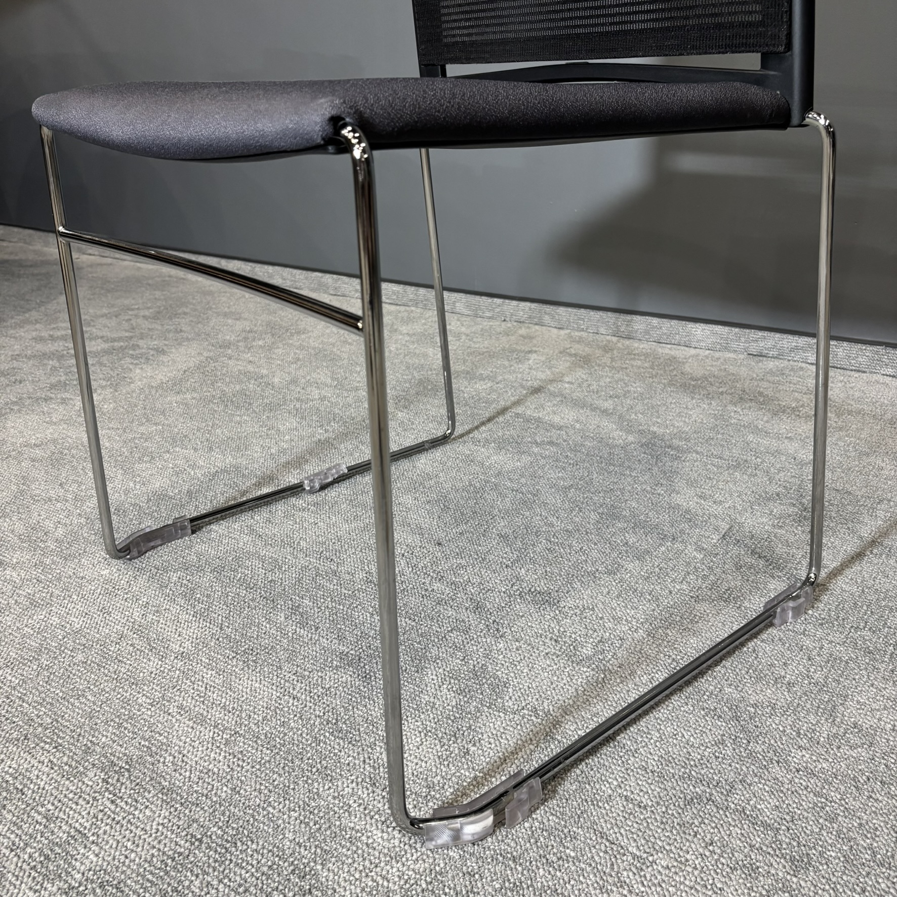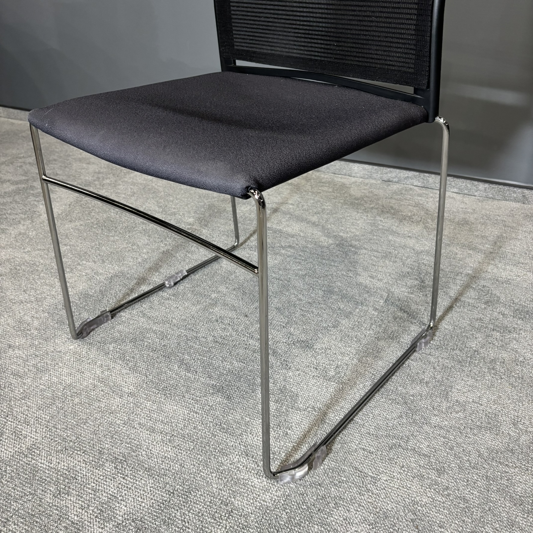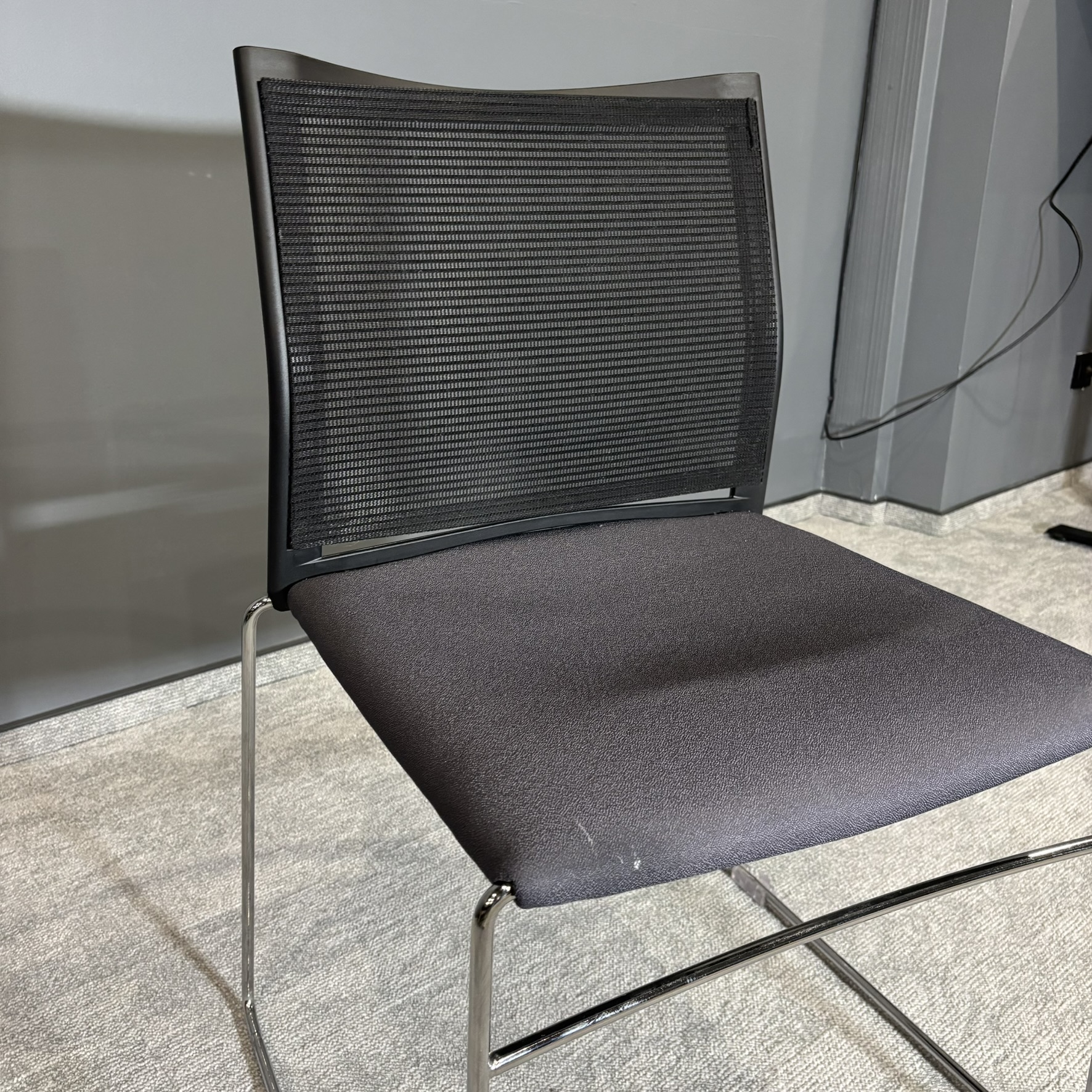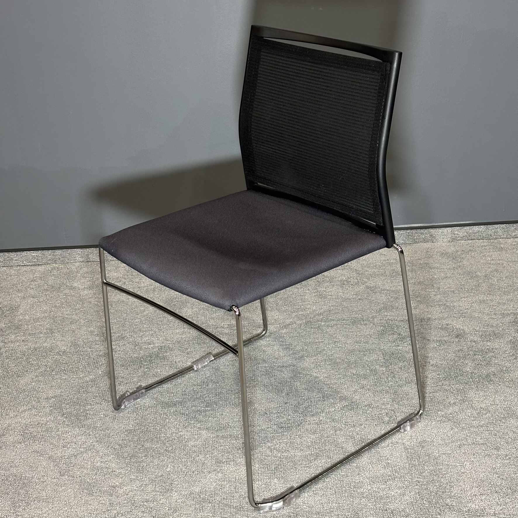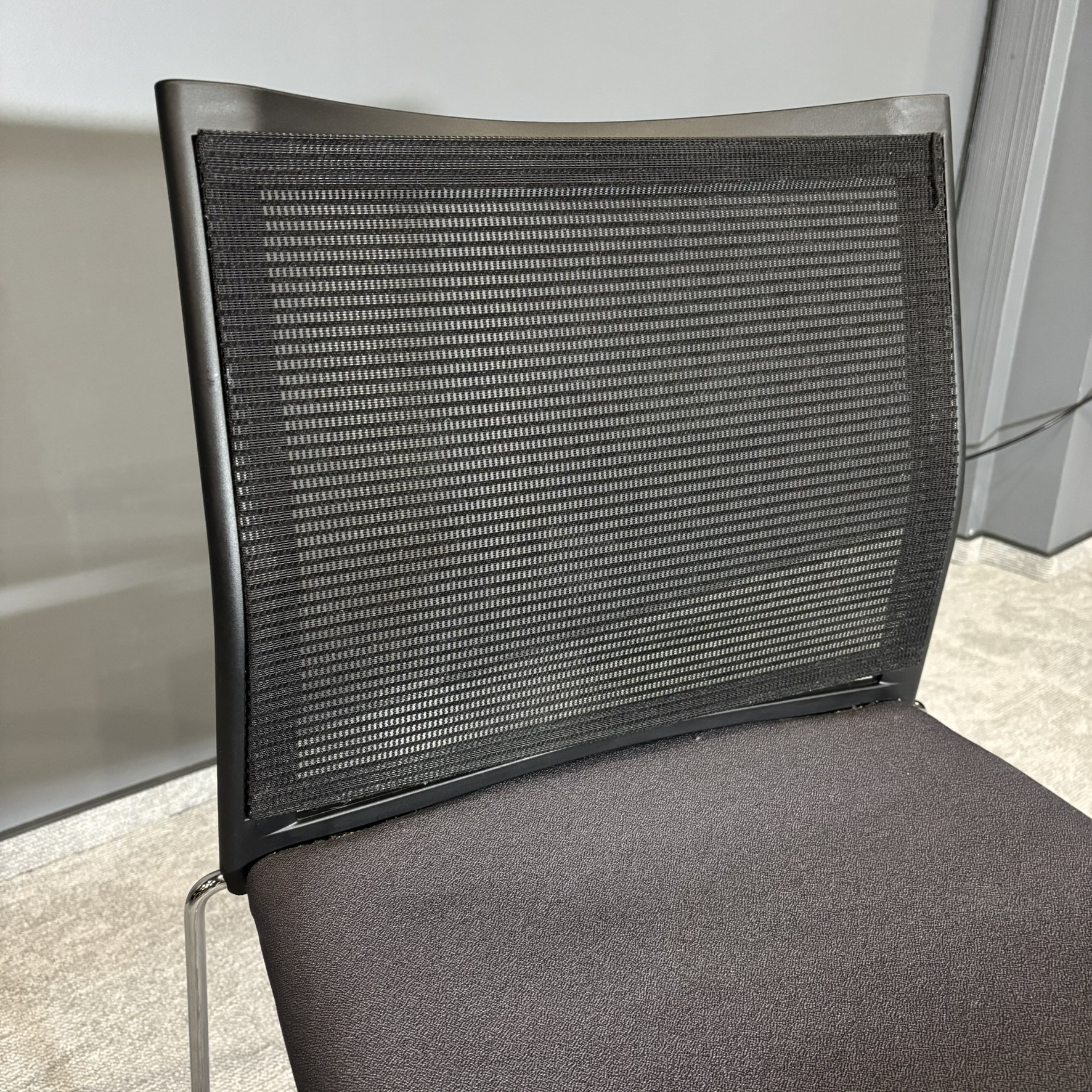 Połączenie tapicerowanego siedziska z przewiewnym oparciem z siatki zapewnia komfort nawet podczas dłuższych spotkań, a minimalistyczna forma sprawia, że krzesło łatwo dopasować do różnych aranżacji biurowych.