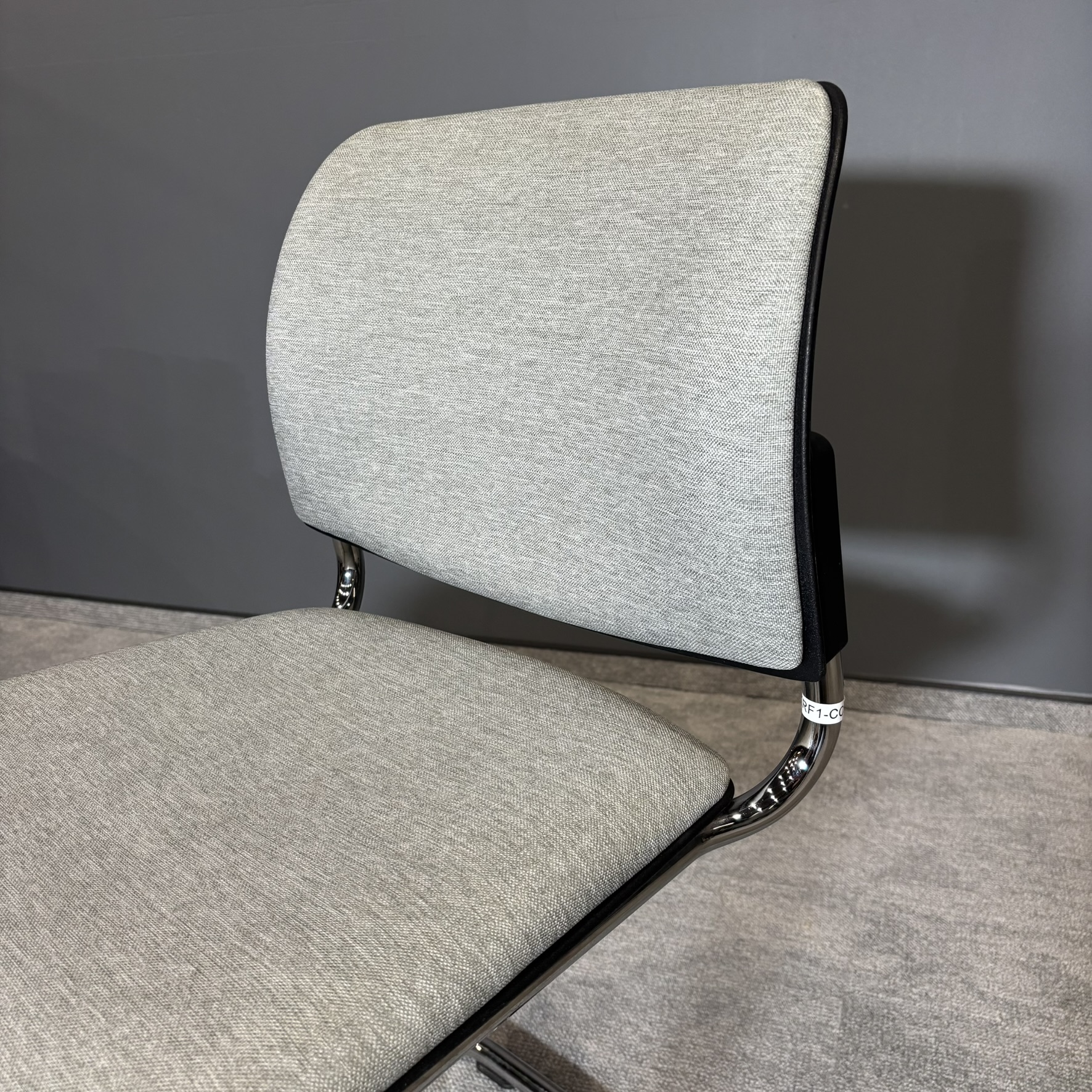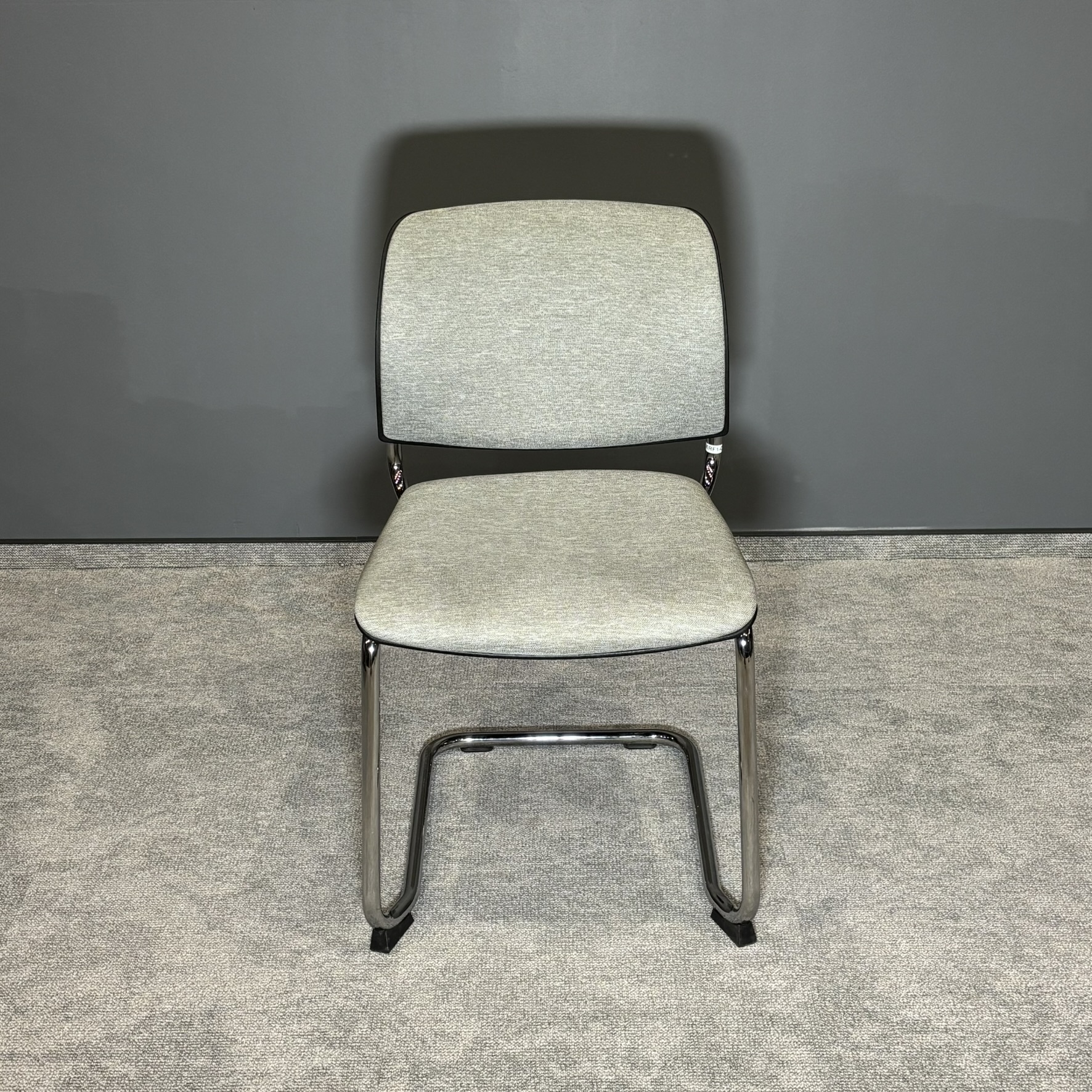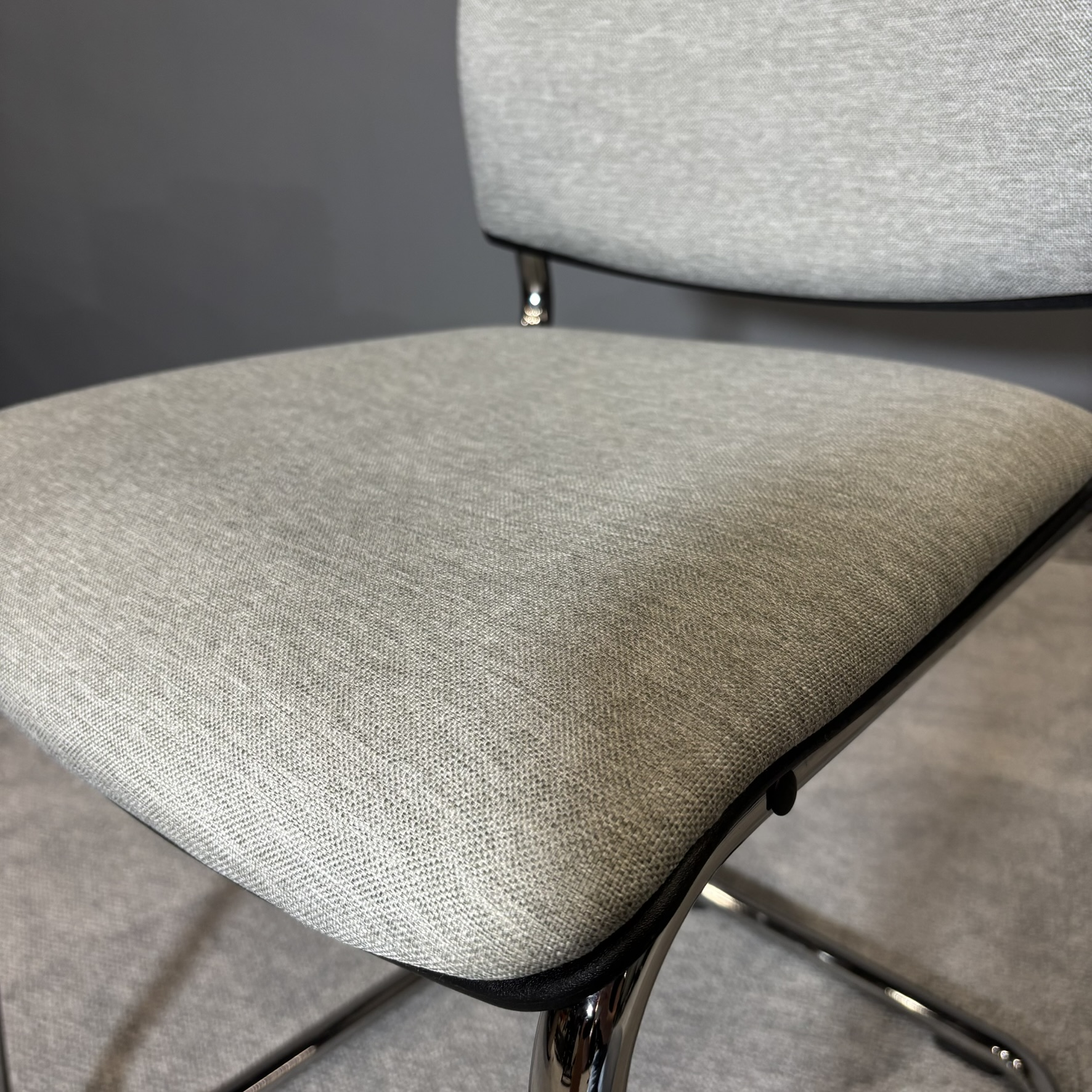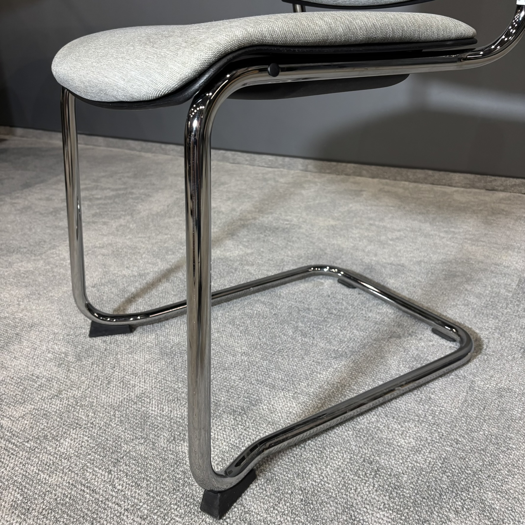 Model osadzony na stabilnej podstawie typu płoza w wykończeniu chromowanym zapewnia trwałość oraz komfort użytkowania. Tapicerowane siedzisko i oparcie w jasnej, neutralnej kolorystyce gwarantują wygodę nawet podczas dłuższego siedzenia.