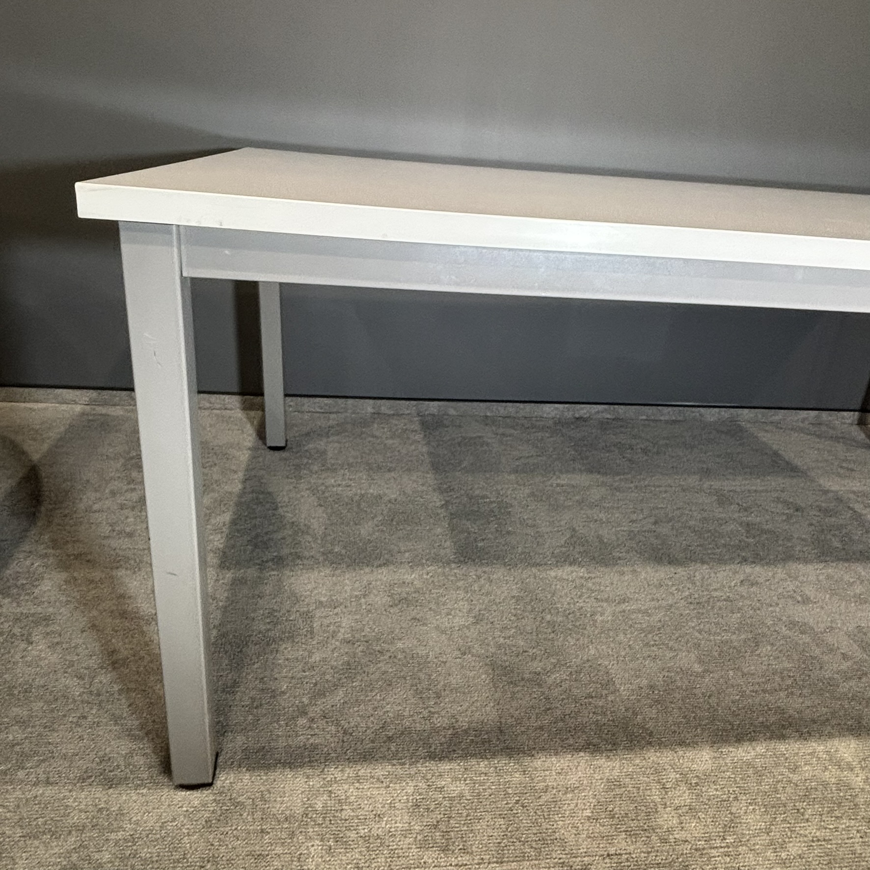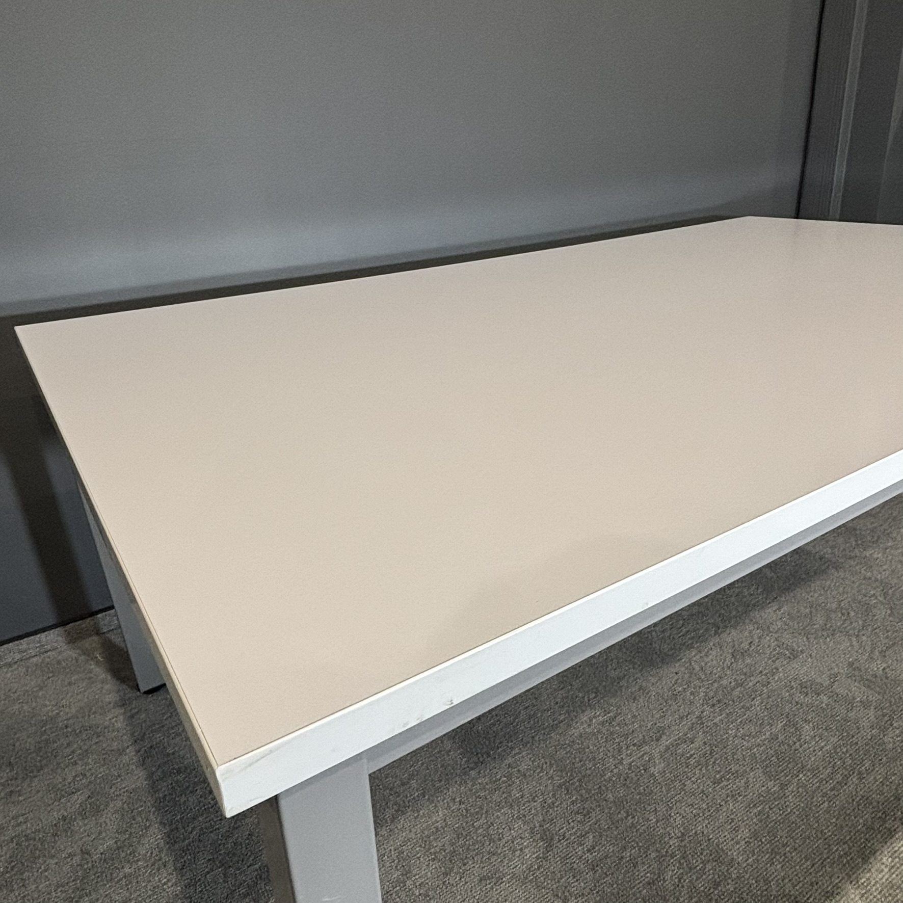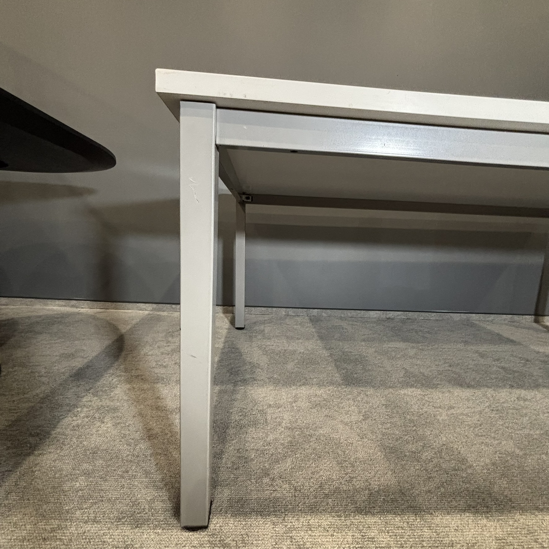Minimalistyczne połączenie białego blatu z aluminiowym stelażem nadaje całości profesjonalny i ponadczasowy wygląd, który łatwo dopasować do różnych aranżacji biurowych.