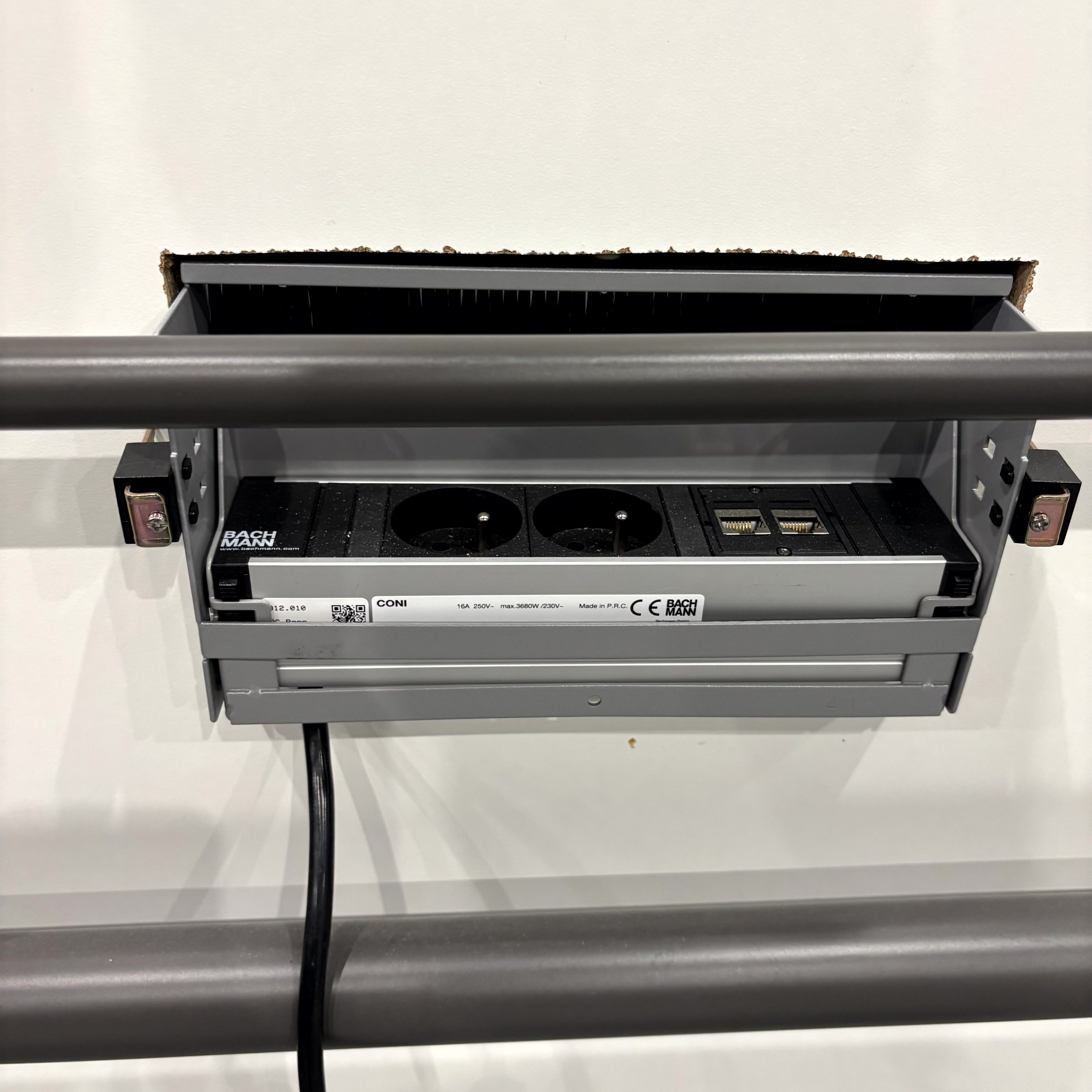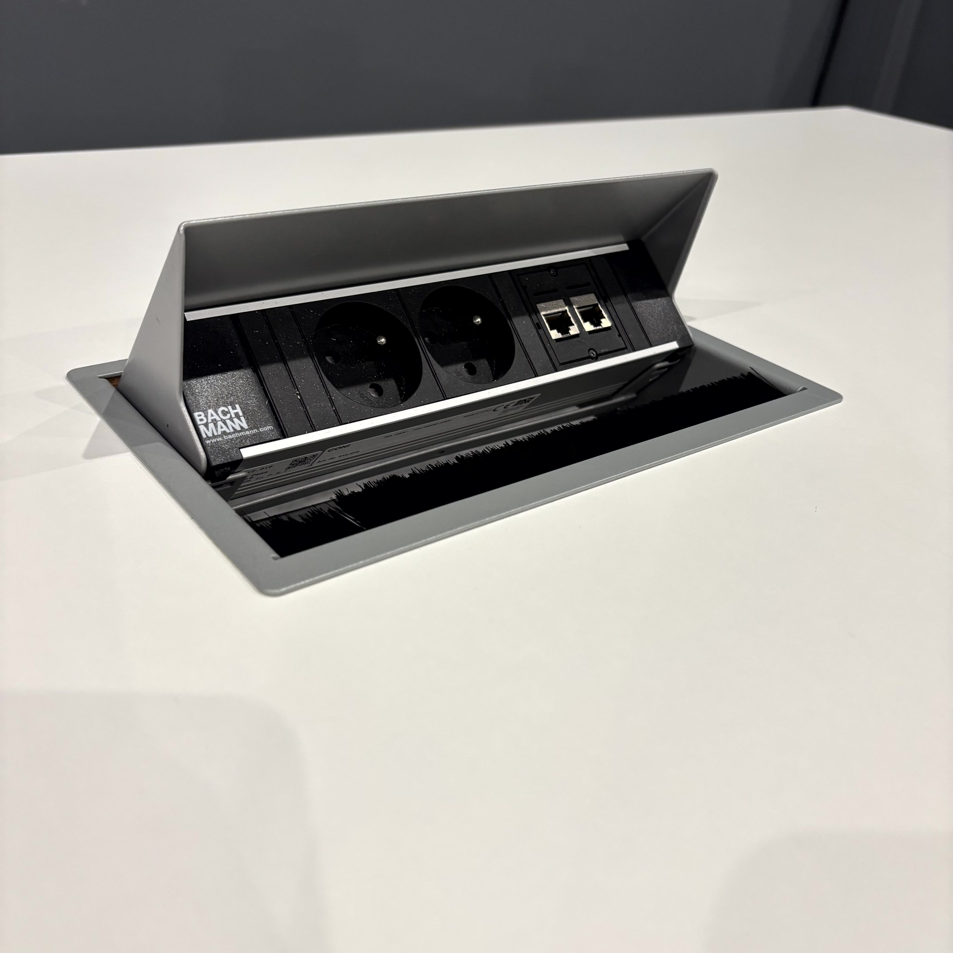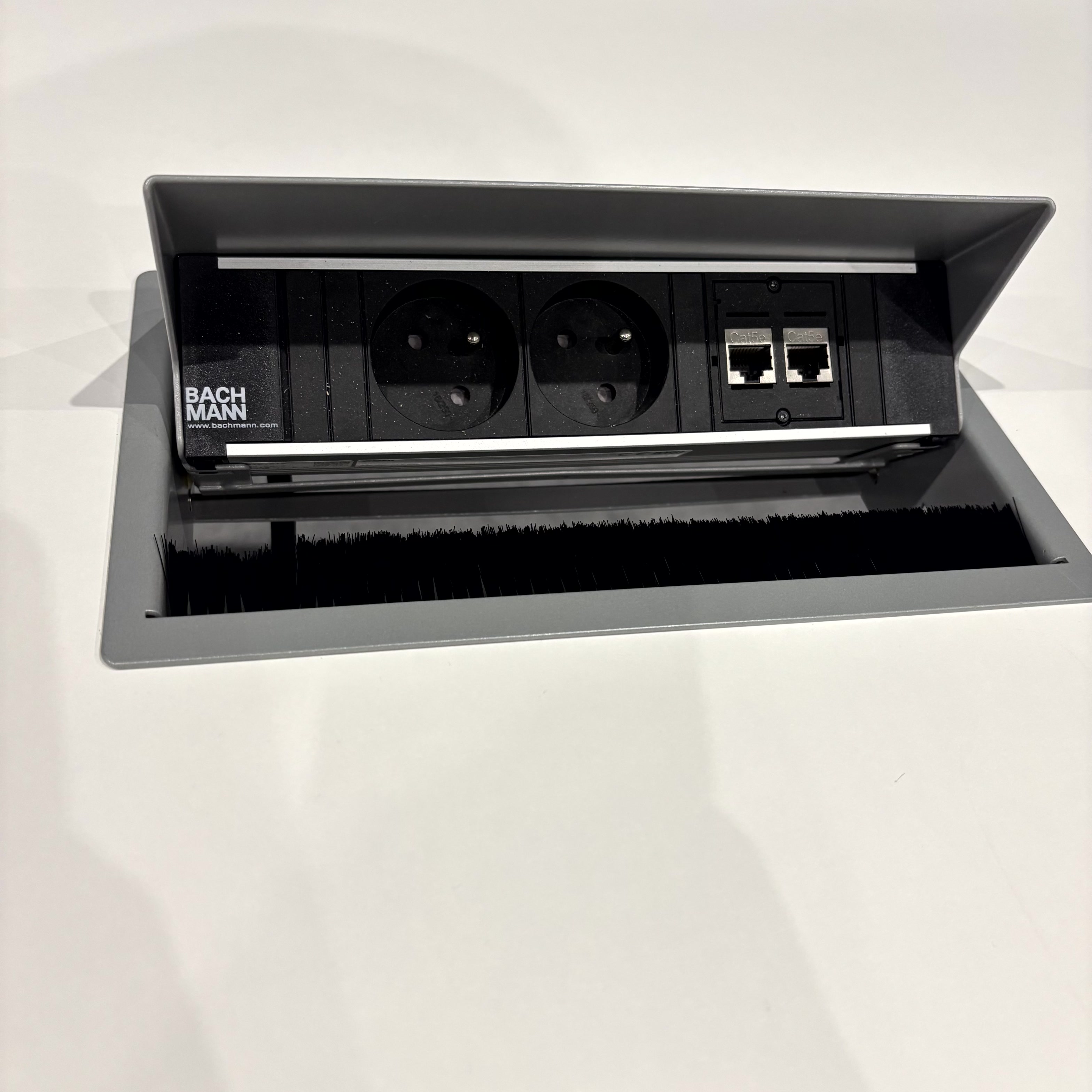 Wbudowany mediaport marki Bachmann zapewnia wygodny dostęp do zasilania oraz sieci – posiada gniazda elektryczne oraz porty LAN, co idealnie sprawdzi się podczas spotkań, pracy zespołowej czy prezentacji.